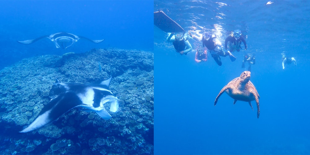 マンタ・ウミガメ&熱帯魚スポット。2ヵ所のスポットをボートで回って行く贅沢なツアーです。美しい川平湾から出発して各スポットまでの移動時間はたったの10分!!外洋のスポットになりますが、初心者の方もしっかりサポートします