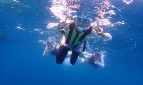 ※6月中旬頃~10月中旬頃の夏季シーズンは水温が暖かいのでラッシュガードなどにライフジャケットのスタイルでシュノーケリングを楽しむことができます。