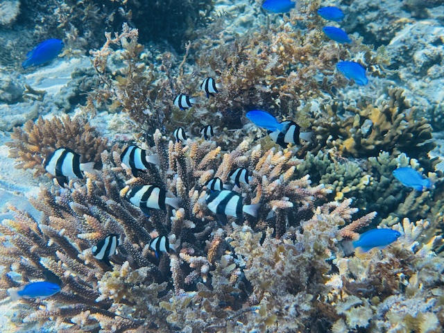 ブルーがキレイなルリスズメダイとシマシマ模様のミスジリュウキュウスズメダイ