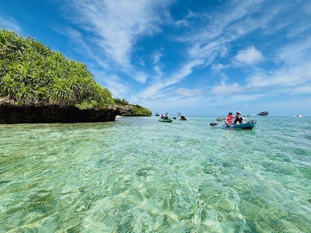 キレイな川平湾のビーチでカヤックの漕ぎ方をしっかり講習してから出発します。小さい子供を除いて基本カヤックは二人乗りになります。端数が出る場合はガイドが一緒に乗るので心配無用です^^目的地まではカヤックに乗って片道約15分程の移動になります。スタートしてすぐエメラルドグリーンの絶景が広がります。ツアーを行うフィールドは川平湾の中でも一番「川平ブルー」がキレイに見える場所になります。